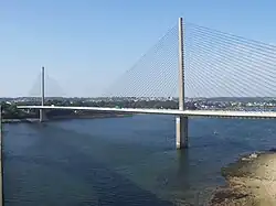 The Pont de l'Iroise (French pronunciation: [pɔ̃ liʁwaz], literally Bridge of the Iroise) is a cable-stayed bridge in Finistère, Brittany, France, which spans the Élorn river where it enters the roadstead of Brest. It carries route nationale 165, the road between Brest and Quimper, and connects Le Relecq-Kerhuon to the north with Plougastel-Daoulas to the south. The bridge is named after the Iroise Sea, into which the roadstead of Brest opens.