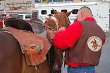 A Pony Express mochila (Spanish,[1] pronounced [mo-chee-lah], for "knapsack", "pack", "pouch") was a removable lightweight leather cover put over a horse saddle for carrying mail and was used by the Pony Express.[2]