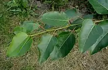 The balsam poplar P. balsamifera (= P. tacamahaca, P. candicans) is a native of North America, where it grows on alluvial bottomlands in the northeastern United States and Canada. It grows to a height of 30 metres and has yellow-grey bark, thick and furrowed, and coloured blackish at the base of the trunk. The twigs are yellow-brown to brown, the buds covered with a layer of balsam resin. The flowers and fruit are very much like those of the white poplar (P. alba) which is a relative of the aspens (Populus sect. Populus).