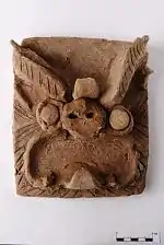 The inner courtyard held the main complex which consisted of a two-part central structure and two flanking galleries. The two buildings of the central structure, one behind the other, stood on square platforms which had been built up of clay layers and faced with bricks which were coated with lime plaster. The larger building was subdivided by wattle-and-daub panels into two halls and a series of smaller rooms. Walls and panels were covered with lime plaster which was painted with geometric designs and horizontal red stripes; the presence of two layers of plaster of different quality suggests repairs. The tiled roof had been supported by 36 wooden columns resting on stone bases. The building appeared to be of post-and-beam construction characteristic of Chinese Tang architecture; this is indicated by burnt timber fragments of interlocking wooden brackets in the Chinese style called dougong.[9] The decorative eave end-tiles recovered from the site are broadly analogous to those found in Tang contexts, however recent studies indicate they form part of a distinctive Uyghur stylistic typology.[10]