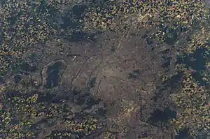 The city of Paris, photographed from Earth orbit by astronauts aboard the International Space Station. The River Seine winds its way through the center of the image. The gray and purple pixels are the urban areas, and the patchwork of green, brown, tan and yellow surrounding the city is farmland