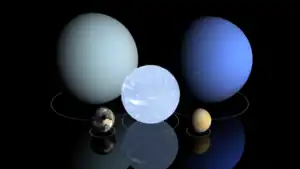 Size comparison of the planets Uranus on top-left, Neptune on top-right, Earth on bottom-left and Venus on bottom-right. It also consists of the white dwarf Sirius B on the center.