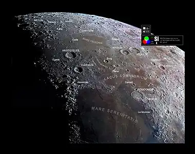 Posidonius is a lunar impact crater that is located on the north-eastern edge of Mare Serenitatis, to the south of Lacus Somniorum. It was named after ancient Greek philosopher and geographer Posidonius of Apamea.[1] The crater Chacornac is attached to the southeast rim, and to the north is Daniell.