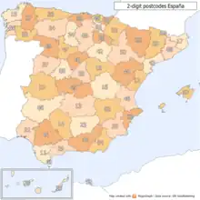 Spanish postal codes were introduced on 1 July 1984,[1] when the Sociedad Estatal de Correos y Telégrafos introduced automated mail sorting. They consist of five numerical digits,[2] where the first two digits, ranging 01 to 52, correspond either to one of the 50 provinces of Spain or to one of the two autonomous cities on the African coast.