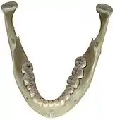 The first species in the genus Homo, Homo habilis, has been found in Tanzania and Kenya at sites dating between 2.1 and 1.5 million years ago.[11] Species within the genus Homo showed no difference within molar size up until Homo floresiensis, where smaller molars were beginning to be expressed.[12] Species after H. floresiensis such as H. heidelbergensis, H. neanderthalensis, and H. sapiens began to show instead wider frontal teeth and a decrease in size of the molars compared to earlier species.[13][14][15] H. sapiens shows significantly smaller molars, mandible, and a prominence of the chin.[15]