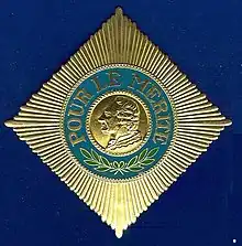 The Pour le Mérite (German: [puːɐ̯ lə meˈʁiːt];[3] French: [puʁ lə me.ʁit], lit. 'For Merit'), also informally known as the "Blue Max", is an order of merit (German: Verdienstorden) established in 1740 by King Frederick II of Prussia. The Pour le Mérite was awarded as both a military and civil honour and ranked, along with the Order of the Black Eagle, the Order of the Red Eagle and the House Order of Hohenzollern, among the highest orders of merit in the Kingdom of Prussia. The order of merit was the highest royal Prussian order of bravery for officers of all ranks.[4][5]