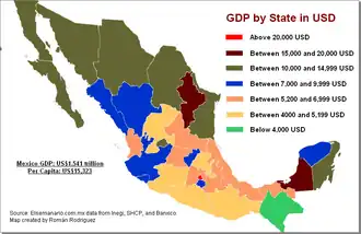 The concentration of poverty and distribution of wealth and opportunities is clearly visible from a geographic perspective.[60] The northern region of the country offers higher development while the southern states are the most impoverished. This is clearly the result of states equipped with better infrastructure that others. The states of Chiapas, Oaxaca, and Guerrero are among the least developed in the country. These states hold the highest numbers of indigenous population. As a result, 75 percent of the indigenous population lives on moderate poverty line and 39 percent of these under extreme poverty.[61]