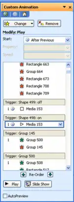 Animation Trigger is another feature introduced in Microsoft PowerPoint 2002/XP and the later versions (but, only supported on Macintosh since 2019, in Office 365[1]). This feature allows animators to apply effects that can be triggered when a specific object on the Slide Show is clicked. This feature is the basis for the majority of PowerPoint games, which usually involve clicking an object.