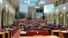 The Prague City Assembly (Czech: Zastupitelstvo hlavního města Prahy (ZHMP)) is the elected legislative body of Prague, the capital city of the Czech Republic. The capital city of Prague is a separate type of territorial self-governing entity and is therefore neither a region nor a municipality. The assembly has similar powers to those of Czech regional and municipal councils. It is composed of 55 to 70 members who are elected as part of the municipal council elections for 4 years.[1]