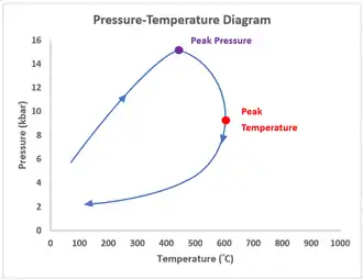 - Initial heating and compression until arriving a peak, a high pressure-low temperature peak is often observed. (Prograde metamorphism until peak)[2]