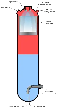 A pressurizer is a component of a pressurized water reactor. The basic design of the pressurized water reactor includes a requirement that the coolant (water) in the reactor coolant system must not boil. Put another way, the coolant must remain in the liquid state at all times, especially in the reactor vessel. To achieve this, the coolant in the reactor coolant system is maintained at a pressure sufficiently high that boiling does not occur at the coolant temperatures experienced while the plant is operating or in any analyzed possible transient state. To pressurize the coolant system to a higher pressure than the vapor pressure of the coolant at operating temperatures, a separate pressurizing system is required. This is in the form of the pressurizer.