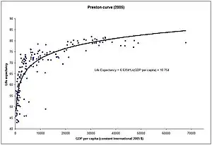 The Preston curve is an empirical cross-sectional relationship between life expectancy and real per capita income. It is named after Samuel H. Preston who first described it in 1975.[1][2] Preston studied the relationship for the 1900s, 1930s and the 1960s and found it held for each of the three decades. More recent work has updated this research.[3]