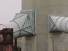 • Guide supports: Often rings inside a structural frame, with angle guides, that allow the duct to grow vertically while restraining the duct laterally for wind loads.