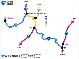 Provincial Highway 30 (Chinese: 台30線) is a 35.433-kilometer highway, which starts from Zhuoxi, Hualien and ends in Changbin, Taitung. This highway passes through Hai'an Range from the Pacific coast to the Huatung Valley and connects Provincial Highway No.11 and Provincial Highway No.9.