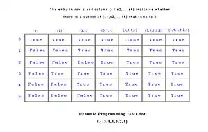 - p(i, j) be True if a subset of { x1, ..., xj } sums to i and False otherwise.