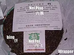 When bought in large quantities, pu'er tea is generally sold in stacks, referred to as a tǒng (), which are wrapped in bamboo shoot husks, bamboo stem husks, or coarse paper. Some tongs of vintage pu'er will contain a tǒng piào ( ), or tong ticket, but it is less common to find them in productions past the year 2000.[12] The number of bǐngchá in a tǒng varies depending on the weight of individual bǐngchá. For instance one tǒng can contain: