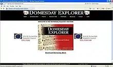 The Domesday Explorer was developed by John Palmer of University of Hull and his son Matthew Palmer as a private project beginning 1986 and using Microsoft Access, later turned into a publicly funded project, receiving a grant of £250,000 from the British Arts and Humanities Research Council. It was published on CD-ROM in 2000, and eventually made publicly accessible online by the University of Essex in 2008.[22] The database includes high-resolution manuscript images, the text of the Phillimore translation (ed. John Morris), geographic information for interactive mapping of searches, stock charts of all reported livestock and statistics reports on each county of the survey. These were produced by Palmer using the work of previous Domesday experts such as Ellis, Maitland and Finn.