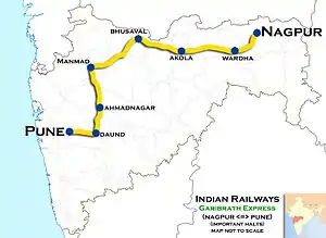 The 22123 / 24 Pune–Ajni AC Superfast Express runs from Pune Junction via Daund Junction, Manmad Junction, Jalgaon Junction, Bhusaval Junction,Nandura, Akola Junction, Badnera Junction, Wardha Junction to Ajni.[2]