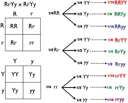 The forked-line method (also known as the tree method and the branching system) can also solve dihybrid and multi-hybrid crosses. A problem is converted to a series of monohybrid crosses, and the results are combined in a tree. However, a tree produces the same result as a Punnett square in less time and with more clarity. The example below assesses another double-heterozygote cross using RrYy x RrYy. As stated above, the phenotypic ratio is expected to be 9:3:3:1 if crossing unlinked genes from two double-heterozygotes. The genotypic ratio was obtained in the diagram below, this diagram will have more branches than if only analyzing for phenotypic ratio.