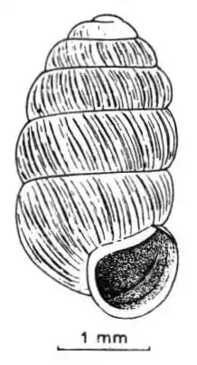 The shells of Pupilla loessica are about 3 mm high, thin, cylindrical-ovate and have a rounded conical apex.[1] The approximately 5 strongly curved whorls gradually increase in height and are finely and irregularly ribbed.[1] The short elliptical aperture has no denticles, no palatal callus and is only slightly broadened.[1] The crest is at most indicated by a weak band.[1]