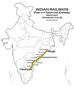 The 17479 / 17480 Puri–Tirupati Express is an Express train belonging to South Coast Railway zone that runs between Puri and Tirupati in India. It is currently being operated with 17479/17480 train numbers on weekly basis.[1][2][3][4]