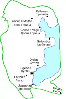 The village of Cerje was first mentioned in documents from the 14th century. The names of other villages were found in more modern documents. According to a 1900 ethnographic survey, the number of inhabitants at the time was 1,830.[7] The "La Macédoine et sa Population Chrétienne" survey by Dimitar Mishev (D. Brankov) from 1905 shows that the local Christian inhabitants were divided between Bulgarian Exarchate and Patriarchate of Constantinople.[8] On 18 March 2013, the Albanian government changed the official name of the municipality, from the Albanian Liqenas to the Macedonian Pustec.[9]
