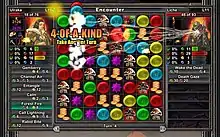 Combat in the title is conducted entirely via turn-based puzzle action similar to Bejeweled or Zoo Keeper. The player and the computer-controlled opponent take turns swapping the position of two horizontally or vertically adjacent tiles on a grid to make a row or column of at least 3 like tiles; these tiles are removed with various effects as listed below, and all tiles above them fall to fill in the spaces, with new tiles created at the top of the board. If, by this action, a new row or column of three or more like tiles is formed, this is also removed and the chain can continue indefinitely. An extremely long chain can earn the player additional bonuses. If either combatant can match four or more tiles in a line, that combatant will be given an extra turn and potentially additional bonuses. If no move to make a match of 3 is available, the board is reset for both combatants.
