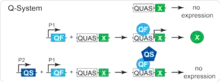 The Q-system is based on two out of the seven genes of the qa gene cluster of the bread fungus Neurospora crassa.[7] The genes of the qa cluster are responsible for the catabolism of quinic acid, which is used by the fungus as a carbon source in conditions of low glucose.[7] The cluster contains a transcriptional activator qa-1F, a transcriptional repressor qa-1S, and five structural genes. The qa-1F binds to a specific DNA sequence, found upstream of the qa genes. The presence of quinic acid disrupts interaction between qa-1F and qa-1S, thus disinhibiting the transcriptional activity of qa-1F. Genes qa-1F, qa-1S and the DNA binding sequence of qa-1F form the basis of the Q-system. The genes were renamed to simplify their use as follows: transcriptional activator qa-1F as QF, repressor qa-1S as QS, and the DNA binding sequence as QUAS.[2] The quinic acid represents the fourth component of the Q-system. The original transactivator QF appeared to be toxic when expressed broadly in Drosophila. To overcome this problem, two new transactivators were developed: QF2 and QF2w.[3]