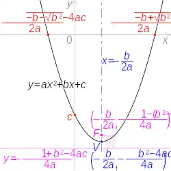 Visualisation of the complex roots of y = ax2 + bx + c: the parabola is rotated 180° about its vertex (orange). Its x-intercepts are rotated 90° around their mid-point, and the Cartesian plane is interpreted as the complex plane (green).[3]