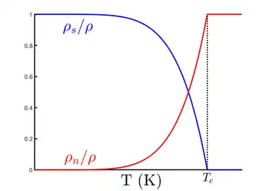 The relative proportions of the two components change with temperature, from an all normal fluid flow at the transition temperature ( and ), to a complete superfluid flow in the zero temperature limit ( and ). At small velocities, the two-fluid equations are