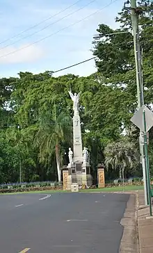 The First World War Memorial is situated in a dominant position at the entrance to the Botanic Gardens, surrounded by a low rock wall garden bed. At the rear of the memorial is a set of large swing gates of wrought iron painted white and bearing commemorative lettering and the Australian Imperial Force badge. The gates are flanked by Helidon sandstone pillars. The memorial stands 45 feet (14 m) to the top of the obelisk and comprises a base, four statues and the obelisk surmounted by a Winged Victory statue.[1]
