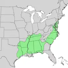 The species is most common in the American south and eastern states.[4] It can be found from Long Island Sound south to northern Florida, and west to southernmost Illinois, Missouri, Oklahoma, and eastern Texas.[5] Its natural range extends into southeastern Pennsylvania and southern New Jersey. It has also historically been recorded as occurring in Lancaster, Bucks, Chester, Delaware, and Philadelphia counties, chiefly on wet sites, occasionally in drier, upland ones.[6] Much of that area has been built over and developed since World War II, and the tree is now classified as endangered in the state.
