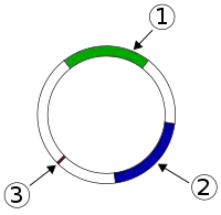 An example plasmid with two areas of antibiotic resistance coding DNA (1,2) and an origin of replication (3).