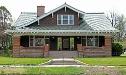 Its construction of the R.T. Frazier House was announced and reviewed favorably by the Pueblo Star Journal, the local newspaper, in 1916, which called it "utter perfection".[2] It has been speculated that the house may have been designed from the popular style of books of the time period.[4] It is a front-gabled house with tapestry brick and rhyolite stone; the foundation appears to be made of ryolite stone with the four large pillars. The porch and the railing made of sandstone.[2]