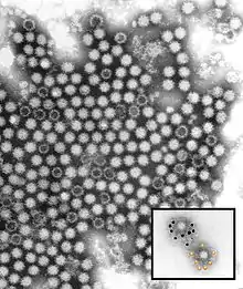 Rabbit hemorrhagic disease virus (RHDV) is a virus in the genus Lagovirus and the family Caliciviridae. It is a nonenveloped virus with a diameter around 35–40 nm, icosahedral symmetry, and a linear positive-sense RNA genome of 6.4–8.5 kb. RHDV causes a generalized infection in rabbits that is characterized by liver necrosis, disseminated intravascular coagulation, and rapid death. Division into serotypes has been defined by a lack of cross-neutralization using specific antisera.[5] Rabbit lagoviruses also include related caliciviruses such as European brown hare syndrome virus.[6]