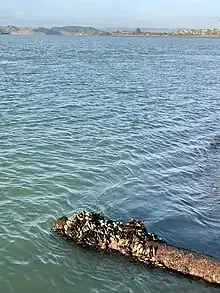 Until 1874 goods were transferred off the beach below Cliff Street[28] and small boats moored in a boat harbour, cut off from the harbour by construction of a sluice-gate under Wallis Street causeway in about 1918.[29] The new road gave access to a new dairy factory and the wharf opened in 1921. A small wooden jetty and storage shed beside Cliff Street was built in 1874.[30] That was replaced by a stone jetty about 1 ch (20 m) to the west in 1881, which remains in place at the foot of the main street. A 250yd wooden pier was built in 1889 to the east at the end of James Street,[28] enabling the larger Northern Steamship vessels to moor in deep water,[31] beside a larger storage shed. Two totara[32] piles remain from that Long Wharf,[28] which was replaced by the current concrete wharf, opened in 1921.[33] The wharf was enlarged for construction of a cement silo for Golden Bay Cement in 1967[28] and a further silo was built in 1973. Cement was supplied for the construction of Huntly power station and the Kaimai tunnel.[27] A fire destroyed the 1921 shed in 2010.[34] A pontoon was added to the east side of the wharf in 2023 as part of a $2.5m Provincial Growth scheme and steps on the other side, with an additional $3.2m of Better Off funding.[35]