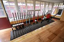 The safeworking of trains between stations on the early lines was time interval working,[49] where a train would be allowed to leave a given time after the train before it. With heavier traffic this method became unsafe, with Staff and Ticket working on single lines adopted from 1873, and telegraph block working from 1878 on double lines.[51] Both of these systems ensured that only one train would be in a section of track at one time. Telegraphic block working was then replaced with Winters Block working between 1883 and 1888,[52] a system that is a predecessor of the Double line Block system which is still used today. Later years saw variations made to the Staff and Ticket system, with busier lines provided with Electric Staff working which provided greater safely when more trains ran.