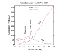 After about 1960, most of the USA rail travel shown in the USA-USSR graph is commuter train travel of (mostly) people going to and from work and not long-distance travel (Amtrak).[32] While air travel in the USA overtook rail travel in the mid 1950s, in the Soviet Union of the late 1980s, rail volume was double that of air travel.[33]