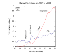 The graph compares the freight traffic (in tonne-km) of the USSR to the US.[19] The USSR rebuilt its rail system and industrialized with five-year plans. As a result, railway freight grew about 20 times from 20 to 400 billion tonne-km by 1941.[20] But then disaster struck again, World War II began. In the first year or so of the war, traffic plummeted to about half its prewar value. But then the USSR started restoring and constructing railways during wartime so that by the end of the war about half of the lost traffic had been recovered. After the war was over it took a few more years to restore the railways and get back to the pre-war level of traffic.