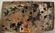 Initially, the study of this gemstone in 1989 concluded that the inclusions were made up of ilmenite (for the iridescence lattice and black triangles) and hematite (for the orange platelets).[3] From 2017 to 2018, six samples of rainbow lattice sunstone were studied using electron microprobe analysis, X-ray diffraction analysis, and laser Raman spectroscopy.[1] It was found that the host mineral is orthoclase (Or96Ab4), as previously reported in the literature and the inclusions causing the aventurescence are hematite. This research also discovered that the lattice patterns consist of orangey brown platelets of hematite and the black platelets consist of magnetite.[1][2]
