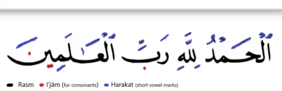 Early written Arabic used only rasm (in black). Later Arabic added i‘jām diacritics (examples in red) so that homographic consonants, for example these five letters ـبـ ـتـ ـثـ ـنـ ـيـ, could be distinguished. Short vowels are indicated by harakat diacritics (examples in blue) which is used in the Qur'an but not in most written Arabic.