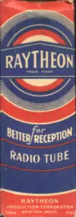 In 1922, two former Tufts University School of Engineering, roommates Laurence K. Marshall and Vannevar Bush, along with scientist Charles G. Smith, founded the American Appliance Company in Cambridge, Massachusetts.[9] Its focus, which was originally on new refrigeration technology, soon shifted to electronics. The company's first product was a gaseous (helium) voltage-regulator tube that was based on Charles Smith's earlier astronomical research of the star Zeta Puppis.[10] The electron tube was christened with the name Raytheon (a compound of Old French and Greek meaning 'light from the gods')[11] and was used in a battery eliminator, a type of radio-receiver power supply that plugged into the power grid in place of large batteries. This made it possible to convert household alternating current to a regulated, high voltage direct current for radios and thus eliminate the need for expensive, short-lived batteries.
