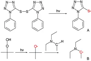 Sulfur tetrazole radical derived from photolysis of disulfide and carbon radical derived from photolysis of t-butyl peroxide followed by proton abstraction from triethylamine