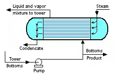 Kettle reboilers (Image 1) are very simple and reliable. They may require pumping of the column bottoms liquid into the kettle, or there may be sufficient liquid head to deliver the liquid into the reboiler. In this reboiler type, steam flows through the tube bundle and exits as condensate. The liquid from the bottom of the tower, commonly called the bottoms, flows through the shell side. There is a retaining wall or overflow weir separating the tube bundle from the reboiler section where the residual reboiled liquid (called the bottoms product) is withdrawn, so that the tube bundle is kept covered with liquid and reduce the amount of low-boiling compounds in the bottoms product.