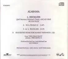 "Reckless" is a song written by Michael Clark and Jeff Stevens, and recorded by American country music group Alabama. It was released in August 1993 as the first single from their album, Cheap Seats. The song was their final number one the Billboard Hot Country Singles & Tracks (now Hot Country Songs) chart until June 2011, when they reached the number one position again with a guest vocal on Brad Paisley's "Old Alabama".