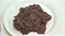 Red bean paste (traditional Chinese: 豆沙/紅豆沙; simplified Chinese: 豆沙/红豆沙; Japanese: あんこ or 小豆餡; Korean: 팥소) or red bean jam,[1] also called adzuki bean paste or anko (a Japanese word),[2] is a paste made of red beans (also called "adzuki beans"), used in East Asian cuisine. The paste is prepared by boiling the beans, then mashing or grinding them. At this stage, the paste can be sweetened or left as it is. The color of the paste is usually dark red, which comes from the husk of the beans. In Korean cuisine, the adzuki beans (often the black variety) can also be husked prior to cooking, resulting in a white paste.[3][4] It is also possible to remove the husk by sieving after cooking, but before sweetening, resulting in a red paste that is smoother and more homogeneous.