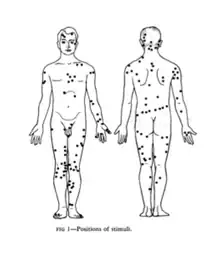 The term mitempfindungen (literally "associated sensations") was first used in 1844 by the German scientist Johannes Müller.[22] "Referred itch" was only used after 1884, in context to the research of Russian physiologist N. Kowalewsky. The phenomenon of referred itch was documented as early as 1733. Around that time, the English scientist Stephen Hales observed that when an area of the body was scratched by the nails, an itching sensation could be triggered on a distant part of the body. He had called the phenomenon the many "Instances of the Sympathy of the Nerves."[23] More extensive observations on the referral of sensation were documented by Kowalewsky, who observed referred sensations on himself. Kowalewsky published his findings in 1884.