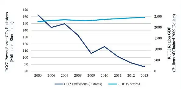 RGGI states have reduced their carbon emissions while still experiencing economic growth. Power sector carbon emissions in the RGGI states have declined by over 50% since the program began.[10] Media have reported on RGGI's success as a nationally relevant example showing that economic growth can coincide with pollution reductions.[11][12][13] In a report on RGGI, the Congressional Research Service has also said that, "experiences in RGGI may be instructive for policymakers seeking to craft a national program."[14]