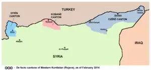 The de facto Autonomous Administration of North and East Syria, sometimes referred to as "Rojava", is divided into several self-governing regions. The Afrin, Jazira and Euphrates Regions followed from the cantons established in January 2014 and were envisioned as sub-divisions for a future federalisation of Syria.[1] The three cantons were later reorganized into three regions with subordinate cantons, areas, districts and communes.