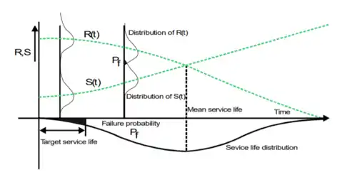The performance-based service life model proposed by the European project DuraCrete,[10] and by FIB Model Code for Service Life Design,[11] is based on a probabilistic approach, similar to the one adopted for structural design. Environmental factors are considered as loads S(t), while material properties such as chloride penetration resistance are considered as resistances R(t) as shown in Figure 2. For each degradation process, design equations are set to evaluate the probability of failure of predefined performances of the structure, where acceptable probability is selected on the basis of the limit state considered. The degradation processes are still described with the models previously defined for carbonation-induced and chloride-induced corrosion, but to reflect the statistical nature of the problem, the variables are considered as probability distribution curves over time.[6] To assess some of the durability design parameters, the use of accelerated laboratory test is suggested, such as the so called Rapid Chloride Migration Test to evaluate chloride penetration resistance of concrete [11]'. Through the application of corrective parameters, the long-term behaviour of the structure in real exposure conditions may be evaluated.
